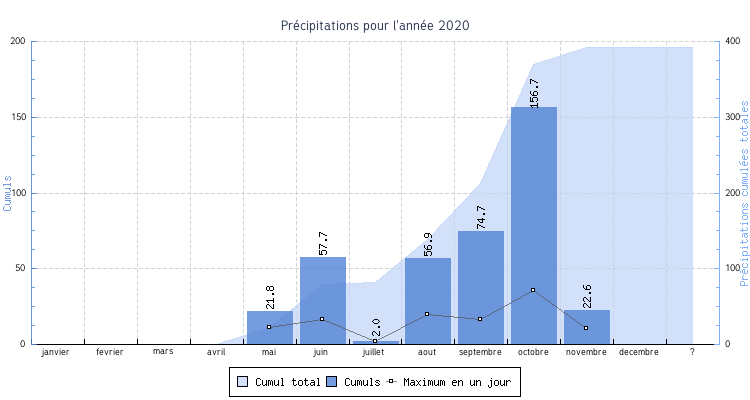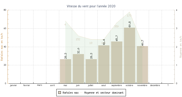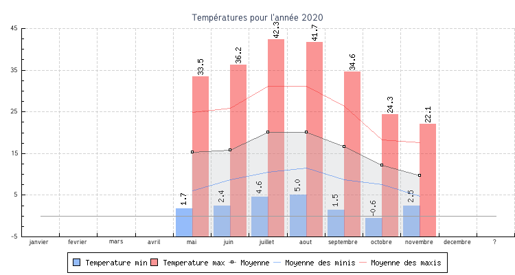 | novembre | 2.5 °C | 4.7 °C | 22.1 °C | 17.6 °C | 9.7 °C | 2.2 km/h | 40.7 km/h | 164 |